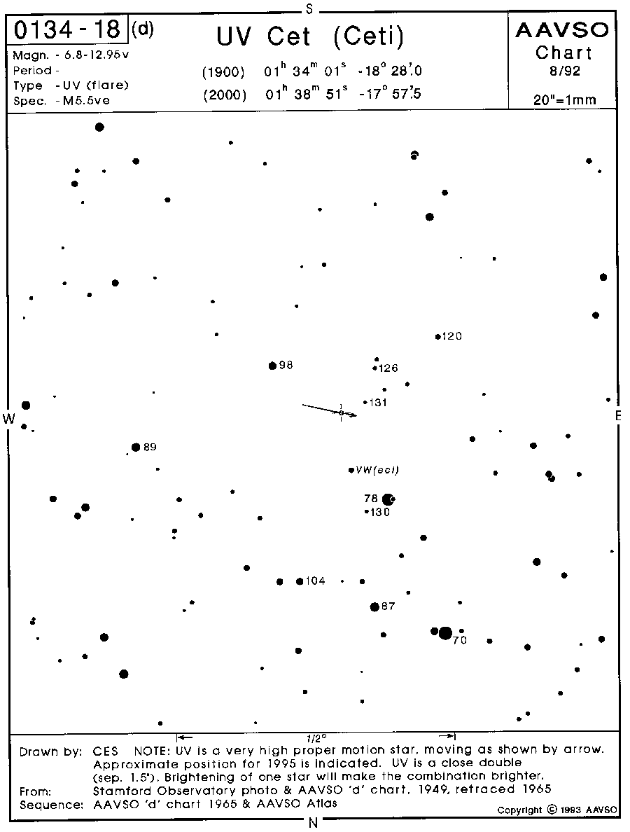 Willem Luytens, who died recently, was a self-proclaimed curmudgeon and astronomical skeptic. UV Ceti was discovered by him and what an interesting system it turned out to be! Burnham describes it as a red dwarf binary system containing two of the smallest and faintest stars yet identified. Occasionally, a flare erupts on one component, outshining the combined light of the two stars by a factor of up to 75. Remarkably, the flare rises to maximum light in seconds.