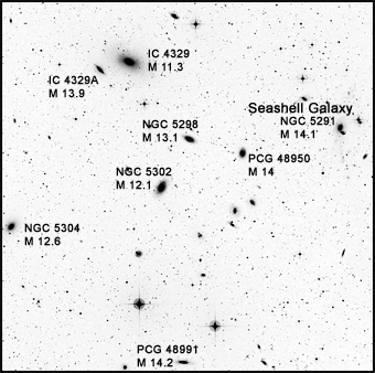 Success! On a recent dark sky trip, we were able to positively identify eight galaxies of Abell 3574 galaxy cluster in Centaurus (near M83) using a 12inch f/7. Appearing almost in the same field of view: IC 4329 (M11.3); IC 4329A (M13.9); NGC 5298 (M13.1); PCG 48950 (M14); NGC 5302 (M12.1); NGC 5304 (M 12.6); PCG 48991 (M14.2); NGC 5291 (M 14.1 Seashell Galaxy). Eric Brindeau |